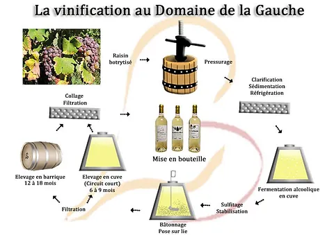 Au Domaine de la Gauche, la cueillette est faite en plusieurs tries, généralement quatre. Les vendangeurs ne choisissent à chaque passage que les grains les plus confits, d'où la fameuse "Crème de Tête" qui fit la réputation du Domaine, devenue maintenant "Cuvée de tête".